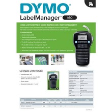 Etichettatrice multiuso LabelManager™ 160. Il perfetto starter-pack per la tua attività, in ufficio o a casa: la soluzione veloce per le etichette più semplici. Formattazione rapida con tasti dedicati one-touch per grassetto, corsivo, sottolineatura, dimensione testo e testo in verticale. 1 font, 6 dimensioni carattere, 8 stili di testo, 4 stili di bordi. 228 simboli e clip-art disponibili. Memoria dell'ultima etichetta stampata. Funzione di spegnimento automatico. Funziona con 6 batterie AAA o con alimentatore AC opzionale (non inclusi). Garanzia 2+1 A.